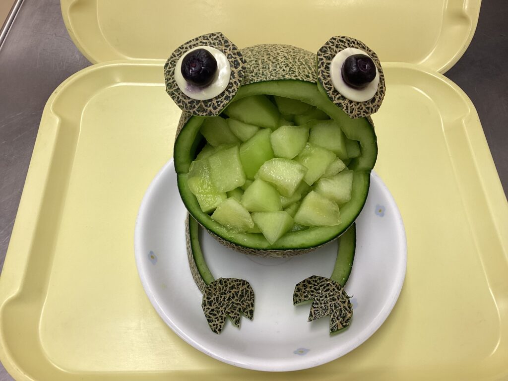 6月21日は夏至ですが、子ども園は1日早くHAREの日でした。これから暑くなるので負けない様に夏野菜の沢山入ったカレーを食べました。季節の果物のメロンがかわいいカエル🐸になったり、ロールケーキがカタツムリに🐌変身したりと楽しい献立でした😀