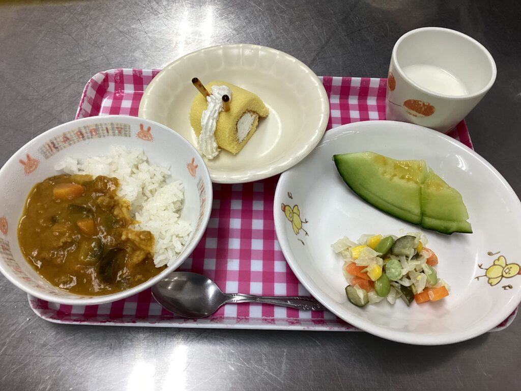 ⚫️夏野菜カレー ⚫️カラフルサラダ ⚫️メロン ⚫️牛乳 ⚫️カタツムリケーキ