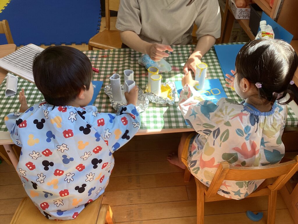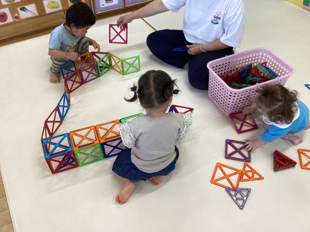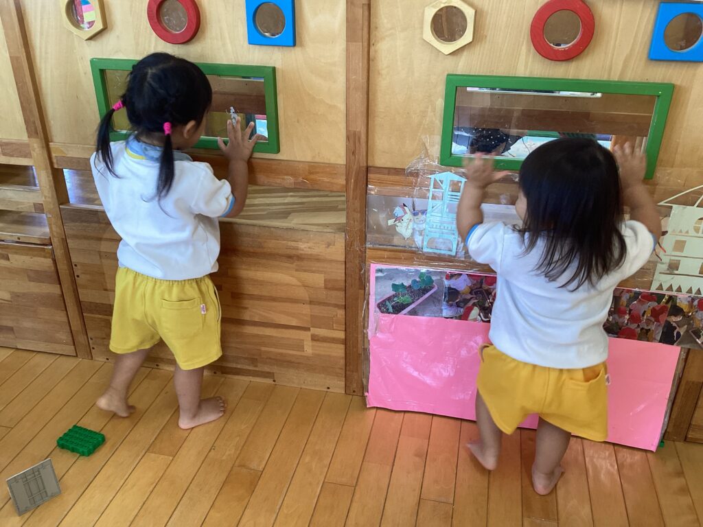 たんぽぽ組(0,1才児)とすみれ組(2才児)のお部屋の間には大型遊具があって、透明窓や隙間からお隣が見えます👀お友だちが見えると大興奮✨手を振ったり声をかけたりして楽しんでいます♪
