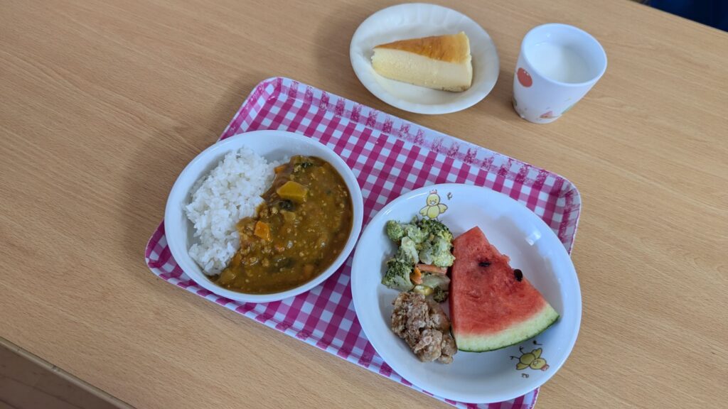 8月お誕生会メニュー 2024 8/07 ブログ 2024年8月7日 給食…◯夏野菜のキーマカレー ◯鶏の唐揚げ ◯ブロッコリーのサラダ ◯スイカ おやつ…◯チーズケーキ いつもは苦手なお野菜もカレーに入っているとパクパク食べて美味しそう!おかわりもしてお腹いっぱいになりました! ブログ 8月1日 たんぽぽ組♡寒天遊び♪ アルバムに写真をアップしました☆ 関連記事 1月23日 誕生日会メニュー 2026年1月23日 1月13日 HAREの日メニュー 2026年1月13日 12/25 クリスマス会🎄with みなとっ子児童クラブ 2025年12月27日 12/25 クリスマス会🎅 2025年12月27日 12/22 クリスマスコンサート🎄 2025年12月27日 12月の誕生会🎂 2025年12月27日 11月の誕生会🎂 2025年12月27日 12月25日 HAREの日メニュー 2025年12月25日